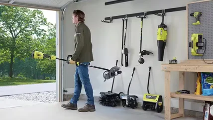 The Rubber Sweeper Attachment is a great addition to your Expand-it arsenal. You can easily sweep away dirt, mulch, and other hard-to-remove debris from hard surfaces and grass using rubber paddles. Though there are other clever attachments, another incredibly innovative one is the Gutter Blower Attachment. Gone are the days when you need to climb on your roof to clean your gutter of leaves and other debris. Ryobi's gutter blower can extend up to 9.5 feet and blow up to 145 MPH. It even works when the debris is wet or dry, which is convenient when dealing with those wet spring days.