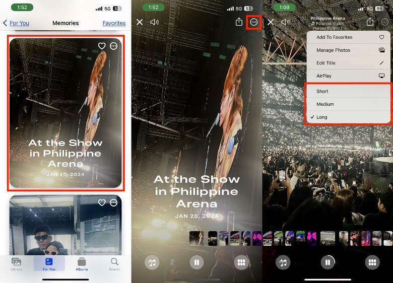 Although the exact number of photos or videos per Memory length may vary, here's an example based on our tests: Short (13 media, 30 seconds), Medium (18 media, 44 seconds), and Long (27 media, 62 seconds). Bear in mind that if there are not enough photos and videos for a certain Memory, you may only have the option to use the short and medium lengths.