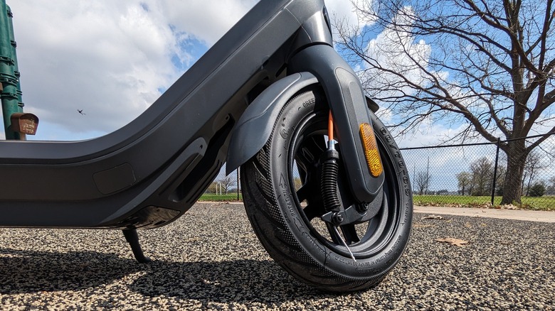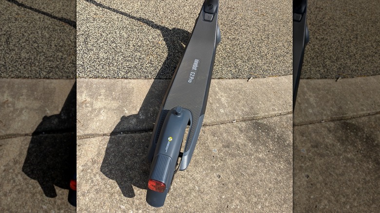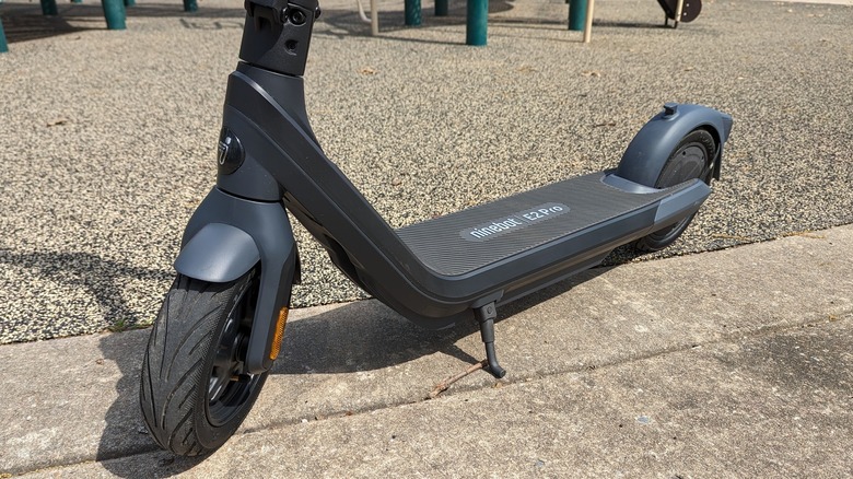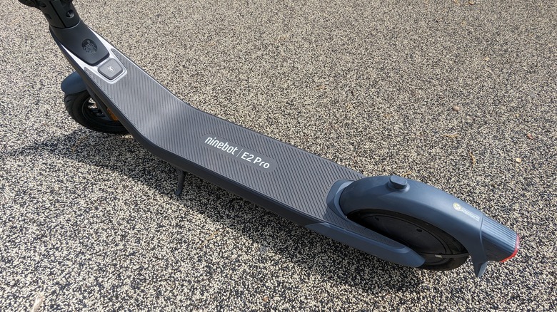 The Segway-Ninebot eKickScooter E2 Pro, which will be referred to as the E2 going forward, is a relatively lightweight machine in a compact package. The rear wheel drives it using a hub-mounted 750-watt electric motor powered by a 275 Wh IPX6 waterproof battery pack. Braking is handled by a drum on the front wheel aided by electric braking using the rear hub motor. The 10-inch wheels are wrapped in pneumatic tires, which Segway lists as "leakproof," contributing to its total payload capacity of 265 pounds.