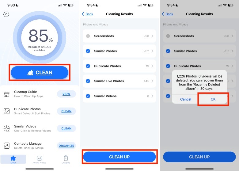 Alternatively, for a faster option, you can go to your Clean homepage and tap Clean. Next, wait for the app to analyze your iPhone's photos and tap Clean Up. In the pop-up provided, review the number of photos and videos it plans to delete and tap OK.