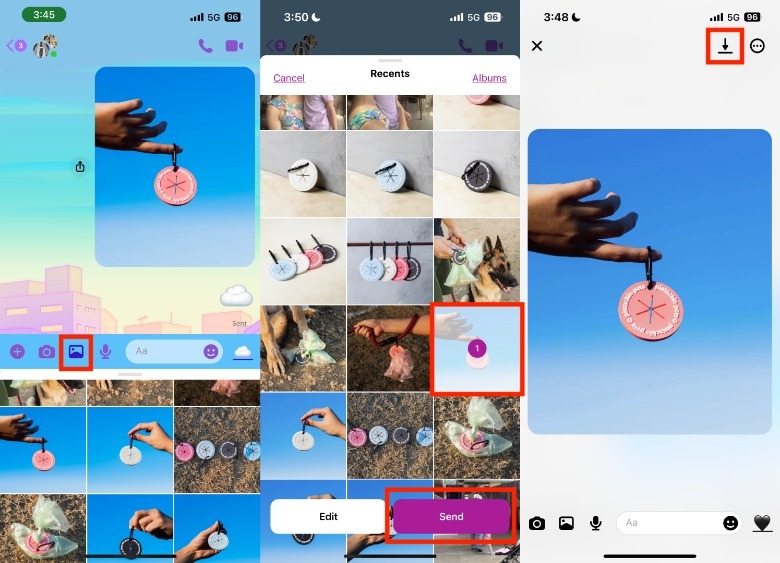 - Tap the photo. In the upper-right corner of the screen, tap the download or downward arrow icon.