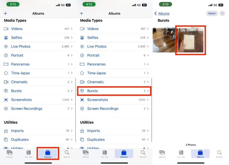 Select the key image of the burst photos you would like to view. In the upper-left corner of the screen, you'll be able to see how many photos are in this specific burst shot.