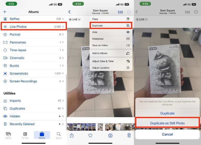 Once the duplicate of the Still Photo appears in your album, you can delete the original Live Photos.