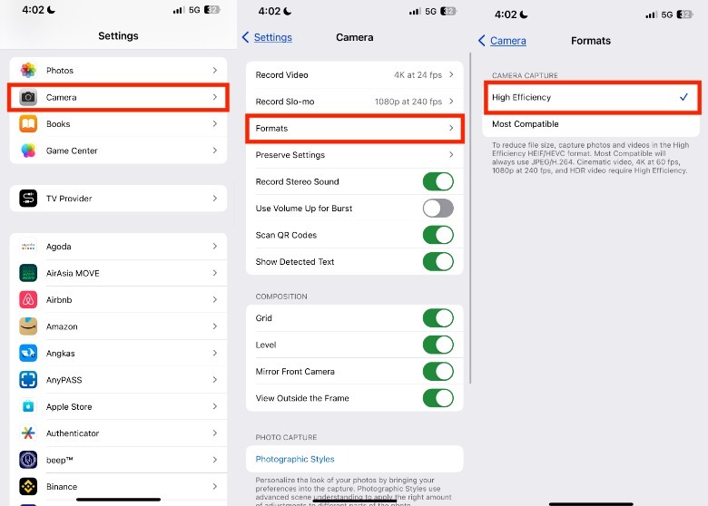 For a long time, keeping photo quality high was important because it would help translate photos better on print. However, these days, it's not as critical if you only ever keep your photos in digital form. So, if you're looking to cut back on your photo file sizes, cutting back on quality is a good way to start. To reduce the overall file size of your iPhone photos, you can use the High Efficiency setting on your iPhone camera. To do this, go to your Settings > Camera > Formats. Next, under Camera Capture, tap High Efficiency. Afterward, your photos will be saved as an HEIF (High-Efficiency Image File) file type.