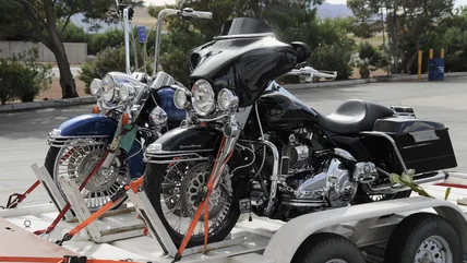 Different motorcycles will have different recommended attachment points which should be referenced in the bike's owner's manual. Use the ratchet straps to secure these attachment points to the trailer bed, being careful to tighten them evenly so they don't pull the bike more firmly in one direction. These lines should be taught, but not so tight that they fully compress the suspension. Be careful not to pinch any brake lines or electrical wiring.
