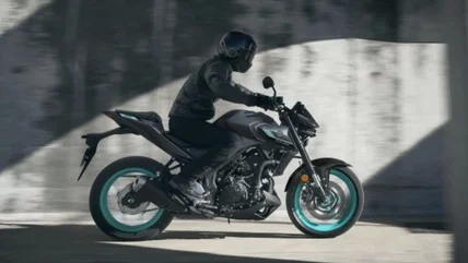 The 2024 Yamaha MT-03 is a naked bike with sharp modern styling and an approachable starting price. You may ask, what's the difference between a naked bike and a sport bike? Essentially, a naked bike is a motorcycle built with a similar design to a sport bike but without the fairings. The riding position tends to be a bit more comfortable (upright), and that's a great starting point for a beginner bike.