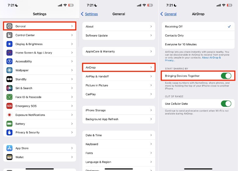 If you don't usually go to crowded places, don't think you're prone to any issues related to it, and prefer to send things using this method, you might want to turn NameDrop on. To do this, go to Settings > General > AirDrop. Under Start Sharing By, toggle on the button next to Bringing Devices Together.