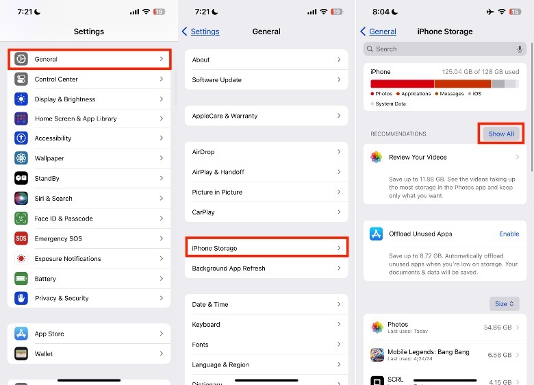 In some cases, Apple's iOS will share its personalized recommendations to resolve your iPhone storage problems. To view those recommendations, go to Settings > General > iPhone Storage and tap Show All next to Recommendations. While not all devices will have these available, it's a great place to start clearing up space for new apps if your iPhone does. In the iPhone storage section, you can also review how much space apps have used in your device in general.