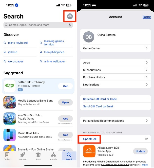 (Optional) Under Upcoming Automatic Updates, tap Update All.