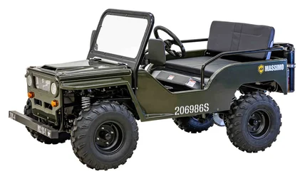 For that price tag, you'll get a military style vehicle with a four-stroke single-cylinder 125cc engine. That comes with a three-speed transmission equipped with forward, neutral, and reverse gears, as well as a four-corner coilover suspension with hydraulic braking. The body is sized for two passengers at a time and is able to safely carry a combined weight of 300 pounds. Of course, seat belts are included with the seats, which are also treated to be water-resistant in case you're driving over puddles. If it's dark out, the Massimo Mini is also equipped with headlights, tail lights, and turn signals for proper illumination.