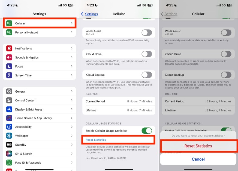 Under Cellular Usage Statistics, tap Reset Statistics.