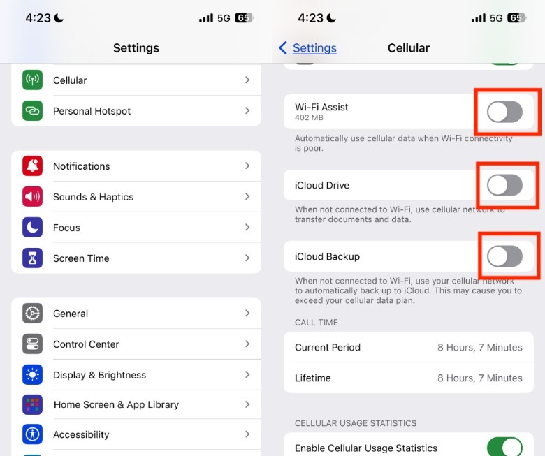 Before we jump into the specific ways to reduce your overall iPhone data consumption, it's important to note that some of the easiest ways include turning on low data mode and connecting to secure Wi-Fi signals, especially if you're going to update software, upload large files, or stream content. Next, you'll want to turn off iCloud Drive and iCloud Backup. While these are very helpful in terms of creating seamless usage between devices, many of us can live with waiting for a stable Wi-Fi connection to do data transfers and backups. To do this, simply return to the Cellular section of your Settings, scroll to the bottom of the screen, and toggle off both buttons next to them.