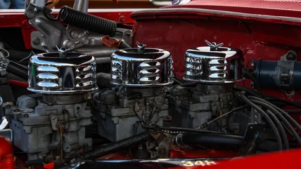 V8 engines have been an American automotive tradition for more than a century. The first production car to get a V8 was the 1917 D series Chevrolet, and Chevy has made heavy use of V8 architecture since 1955 when it introduced a new 265 cubic inch V8. But the company knew that first small-block V8 wasn't going to be powerful enough to move heavier trucks and got to work on a bigger engine. It took three more years to produce the W-series big block V8, a 348 cubic inch beast dubbed the "Turbo-Trust" even though it was normally aspirated and hadn't earned the trust of anyone other than Chevy engineers by then. The 348 weighed a hefty 625 lbs, and with the triple Rochester two-barrel carburetor setup shown above could produce as much as 350 hp.