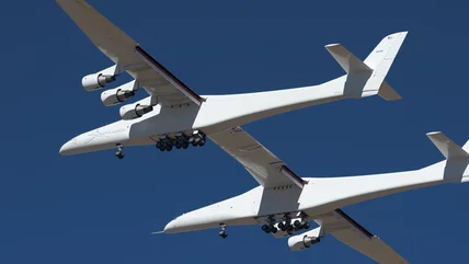 The Stratolaunch's two fuselages are each 238 feet long, with a wingspan of 385 feet. While it is not particularly tall, the weight of the structure when empty is over 750,000 pounds and it can carry a payload of up to 550,000 pounds. Powered by Pratt & Whitney PW4056 turbofans, it can reach speeds of 530 mph and has a maximum range of 1,200 miles.