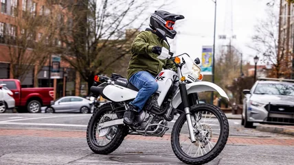 When it comes to top-rated dual sport motorcycles, the Suzuki DR650S is hard to beat — not only is it an excellent 50/50 bike, but it's also one of the most affordable Suzuki motorcycles you can buy today. It features a robust 644cc four-stroke motor capable of roughly 35 horsepower and top speeds exceeding 100 miles per hour. With those specs, the DR650S can handle just about anything you throw at it, be it muddy trails, desolate highways, or congested city streets. The bike weighs just under 370 pounds and has a seat height of 34.8 inches, making it big enough to handle large riders without being uncomfortable or cumbersome for smaller riders.