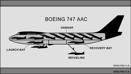 The 747 AAC was designed to store these 10 fighters in a stacked formation inside the huge fuselage, then deploy one fighter every 40 seconds using a special conveyor belt and boom deployment system (which was also a new idea). Altogether, the entire "air wing" of 10 fighters could be in the sky within a quarter of an hour. The planes would go about their mission and then be winched back inside for repairs or get rearmed or refueled as needed, giving the fighters an almost unlimited range.