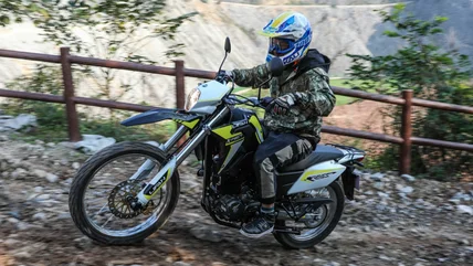 With its 35.6-inch saddle, the KPX 250 is better suited to taller beginners, and its 333-pound net weight is heavy by dual sport standards. Available in green, red, blue, or yellow, the shipped bike arrives 85 percent assembled according to Turbo Motorsports. Take that percentage as a very rough estimate as you'll have to install the headlight, front tire, handlebars, mirrors, and battery.