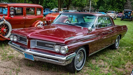 The Pontiac Grand Prix hit the road with tires smoking in 1962. It was available in Super Duty trim with an available 421 cubic-inch V8 that could be topped with twin four-barrel Carter carburetors to make 405 horsepower. Premium interior touches included faux leather front bucket seats with optional power adjustment on the driver's side, stereo speakers in back, and power windows.