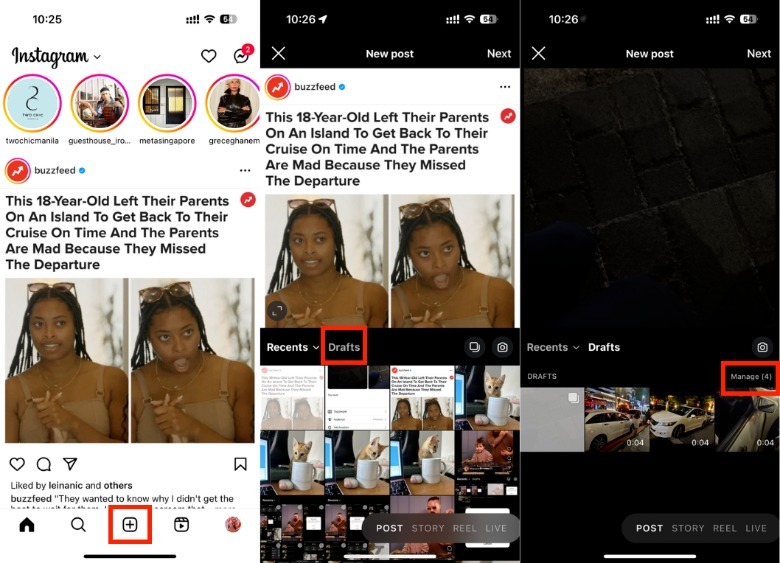 1. On your Instagram app, tap the plus (+) icon at the bottom part of the screen and tap Drafts in the middle of the screen.