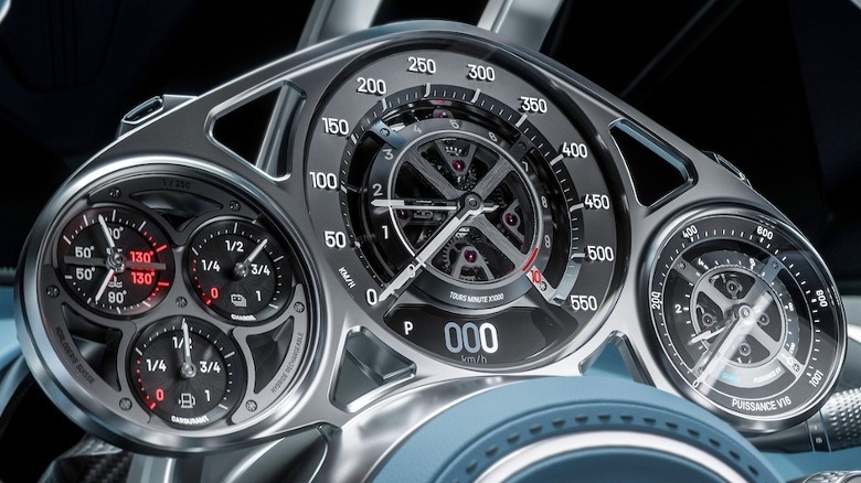 The automaker wants the Tourbillon to dominate posh car shows until the heat-death of the universe. That's why the gauge cluster was put together "with the expertise of Swiss watchmakers," per a Bugatti press release. It's adorned in titanium but also literal rubies and sapphires. A digital screen is still present, but it can be hidden away from view. No one wants to see anything as ghastly as driving directions or music choice when driving a Bugatti.