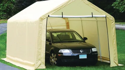 The two most popular portable carports are both enclosed and able to fit a vehicle. The 10-foot by 17-foot, which costs $230, is perfect for smaller sedans and other vehicles. When I owned one, I fit a 1990 Volkswagen Cabriolet inside with plenty of room to spare for storing other items. Lastly, there is a 12-foot by 20-foot portable garage that can fit an SUV or truck — this one runs $400. However, be aware that the height is only 8 feet for this carport, so if your truck is lifted too high, it may not fit.