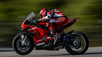 Bikes like the Suzuki Hayabusa are known for their dedication to speed — especially in a straight line. The Busa is powered by a 1340cc four-stroke, four-cylinder engine paired with a six-speed transmission. It has four-piston Brembo brakes up front and single-piston brakes in the rear, as well as a relatively large 5.3-gallon gas tank. The Hayabusa is a big bike though, and its size keeps it from being the most agile machine. Its curb weight checks in at 582 pounds – over 100 pounds heavier than the H2R and 247 pounds heavier than the lightest version of the Ducati Superleggera V4.