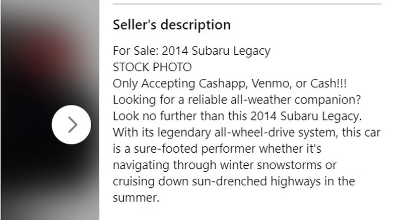 If you have done your research on ballpark car values, and you see a listing for a vehicle that looks impeccable in the pictures but is priced astronomically low, then avoid it like the plague. More than likely, it is a phishing attempt and the person behind the scenes is looking to collect personal information or worse, trying to find a way to have you send them money. Other common red flags to watch out for are listings that have little to no information, vague seller profiles, selling on behalf of someone else, or website links in the description that take you outside of Facebook.