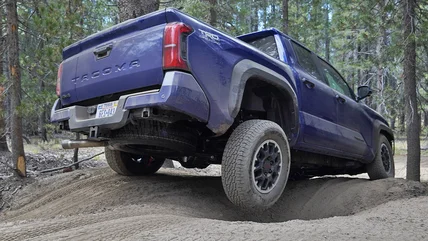 And the Tacoma's hill hold assist function works all wrong, too. After engaging the hill hold, instead of deactivating based on a wheel-speed sensor, the system lets loose the very second the clutch pedal starts to move. So instead of smoothly getting moving, without hill hold or a handbrake, I basically needed to pop the clutch in and out as quickly as possible and give enough gas not to stall (okay, I stalled once). After a dry and dusty burnout, the Taco climbed right up and over this intermediate obstacle—but not without a bit of sweat and plenty of swearing, first.