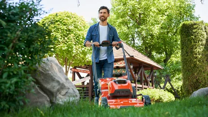 Several of the highest-rated push mowers available are 40V cordless options from Ryobi, including the Ryobi 40V 18-inch 2-in-1 Push Mower. Based on at least 1,130 Home Depot customer reviews, the product has a 4.2 out of five overall rating, with nearly three-quarters of customers recommending it. One of several great Ryobi tools that make yard work easier, the 18-inch 2-in-1 Push Mower is a compact, lightweight machine that's a breeze to push around and maneuver. Since it's battery-powered, start-up is literally as easy as a push of a button, with no messy gas engine to prime or maintain. With a Ryobi 40V 6 Ah battery, the mower can run up to a half hour, which is enough to cover a quarter-acre.