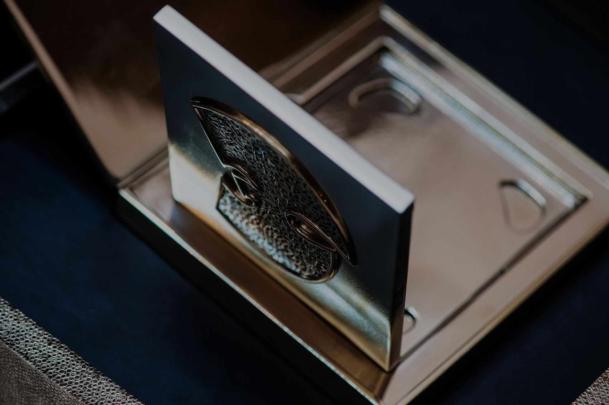 This album is described as "A sonic sculpture presented in a hand-carved nickel-silver box, it is accompanied by a 174-page manuscript containing lyrics, credits, and anecdotes on the production of each song, printed on gilded Fedrigoni Marina parchment and encased in leather by a master bookbinder."