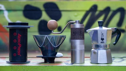 The AeroPress is one of the cheapest and simplest ways to get to 'Flavortown.' It consists of a cylinder, a perforated cap with a paper filter, and a plunger. To make coffee, you first put the paper inside the cap and screw it on the cylinder. Then, place the AeroPress over a mug or pitcher. Next, put ground coffee inside the chamber. Pour hot water over the grounds and place the plunger on top. Wait for a minute or two, then gently press the plunger for the brewed coffee to drip inside your cup.