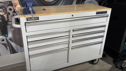 This popular Yukon Mobile Storage Cabinet, priced at $349.99, comes in three color options (red, black, and blue) and features a solid wood top that doubles as a workbench. It provides 10,300 cubic inches of tool storage capable of holding up to 1,200 pounds. While all nine drawers feature ball-bearing slides, two of them can hold up to 200 pounds, and the other seven are rated at 100 pounds each.