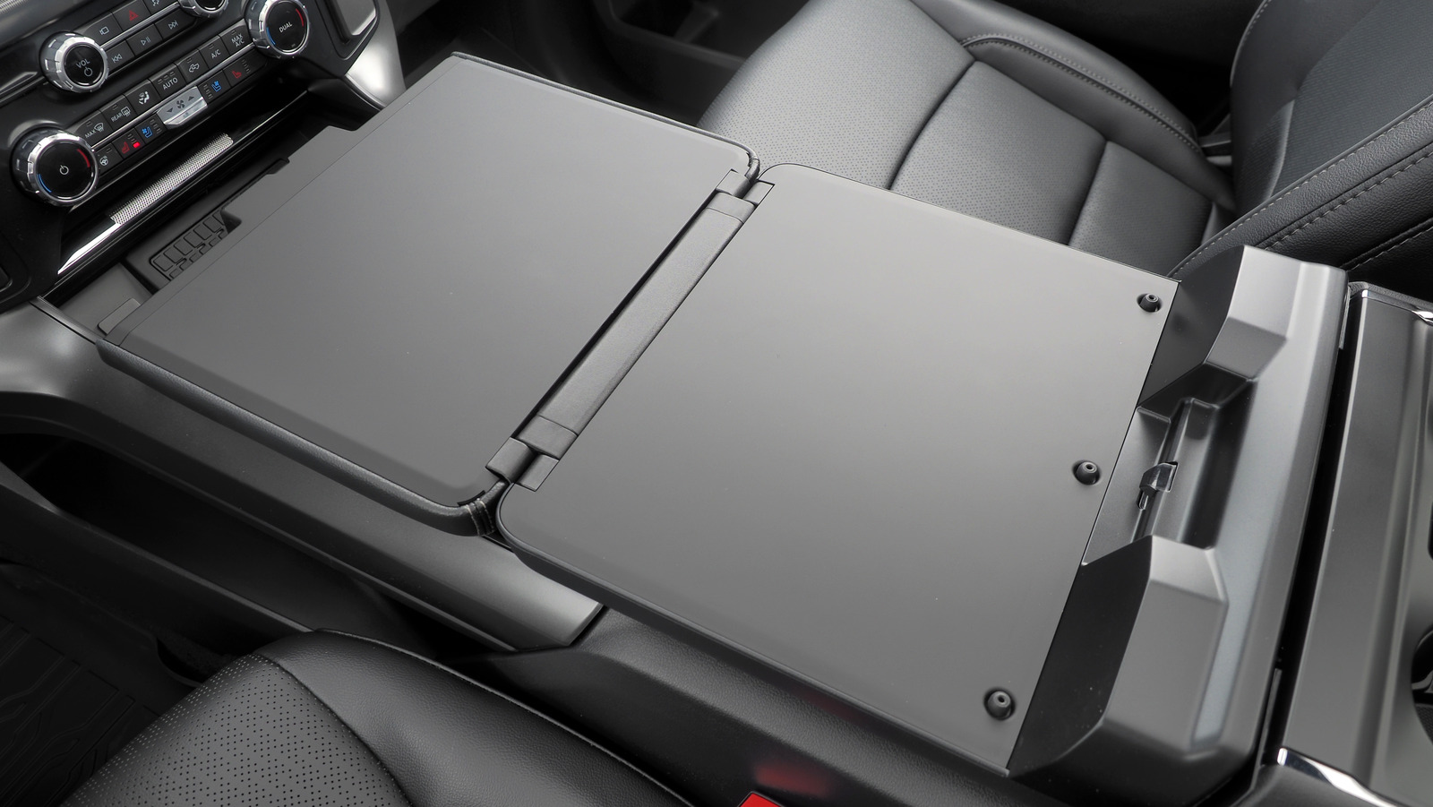 This particular example had the $7,725 Lariat High Equipment Group (502A), too. It adds a head-up display, an upgraded B&O audio system with 14 speakers, heated second row seats, and the Mobile Office Package. Press a button to lower the transmission shifter — it slowly whirs down flush with the console, like a Transformer taking a cold plunge — and you can unfold the front center armrest into a flat desk.