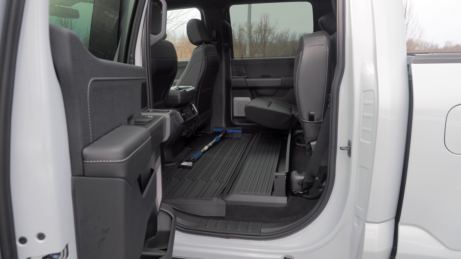 Ford is, at least, liberal with its cubbies and storage bins. In the back, the split rear bench folds up; the resulting floor isn't entirely flat, though. A twin-panel moonroof is $1,495, while the Pro Access tailgate is part of the $1,620 Bed Utility Package. $430 adds a retractable rear center step, while the FX4 Off-Road Package sensibly swaps the Lariat's carpets for tailored (and easy to clean) rubber floor mats.