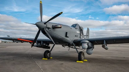 The OA-1K Skyraider II is cooperatively produced by Air Tractor and L3Harris, built from the Air Tractor AT-802, which is used for firefighting and agriculture in the U.S. It has been fully militarized for the Air Force and was previously designated the Sky Warden, used for intelligence, surveillance, and reconnaissance strike. The aircraft boasts short takeoff and landing capabilities, a small footprint on the ground, and can carry out multiple mission requirements, effectively "collapsing the stack" by using one instead of several vehicles.