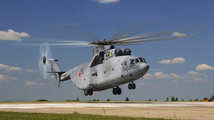 The chopper is powered by PD-8V turboshaft engines, which replaced the previously used Lotarev D-136 engines. The performance metrics for the new engines aren't publicly available, but the previous engines were able to move the helicopter at up to 183.3 mph with a range of 1,196 miles and an operational ceiling of 15,092 feet. Unloaded, the Mi-26 weighs 62,170 pounds, but this balloons to a whopping 123,459 pounds when loaded to its maximum capacity.