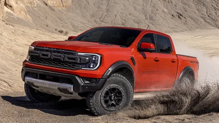 Our number six truck, the slowest of the fastest, is the 2025 Ford Ranger Raptor. This mid-size Ford truck packs a 3.0-liter V6 EcoBoost engine with an output of 405 horsepower, channelled through a 10-speed automatic transmission to all four wheels. The Ranger Raptor is set up for off-road running, with Fox internal bypass shock absorbers, additional ground clearance and ride height, locking differentials in both front and rear, wider tracks, and 33" all-terrain tires.