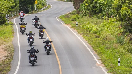 There's a riding style that goes a bit beyond simple signaling, though. Often, especially on highways, you'll see riders traveling in groups, staggered so that they're not riding directly behind or next to another rider. So why is this happening? It's primarily for safety. Riding in a staggered formation gives riders more time and space to react to changing road conditions, a mechanical issue that they or another rider has experienced, or an emergency-braking situation. It also makes riders more visible to other motorists. There are added benefits like taking up less space than a long single-file line of riders, but the primary benefits are related to keeping the rubber on the road.