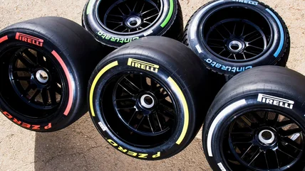 Currently, tire supplier Pirelli provides teams with slicks in three different compounds — hard, medium, and soft — plus wet-weather tires, rated as full-wets or intermediates. Pre-determined colors indicate which is which: white signifies the hard compound, yellow is the medium compound, and red is for the softest slick available. Intermediate tires get a green stripe, while the wets get a blue one, making it easy to identify which tires each team is running in poor weather, too.