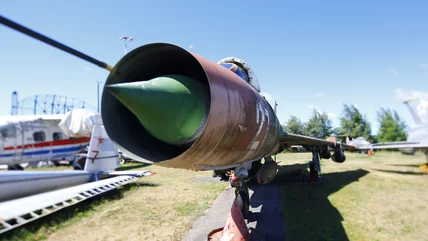 Examples of early fighter jets that use a nose intake are the F-86 Sabre, MiG-19, and the Cold War-era Soviet MiG-21 Fishbed. One of the distinguishing features of the MiG-21 was its use of an adjustable nose air intake that could be extended or retracted depending on its speed. Additionally, the intake configuration had a shock or inlet cone, which generates shockwaves to slow the incoming air to the engine.