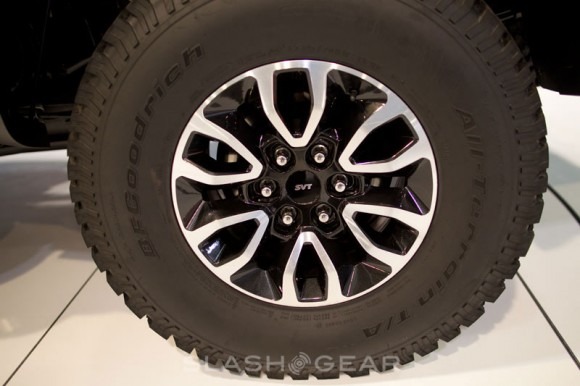 The other big exterior change is the addition of a new wheel style that looks a lot better than the wheels on the 2011 Raptor. The new wheels are a Euroflange design that put the weights on the inside to protect from the bumps and debris that comes with off roading. The new wheels are shod in SVT-tuned 35-inch BFGoodrich All-Terrain TA/KO 315/70-17 tires. The suspension remains the same with internal triple-bypass FOX racing shocks. The big tires and special suspension give the Raptor 11.2-inches of suspension travel in the front and 12.1-inches of rear suspension travel on both SuperCrew and SuperCab versions.
