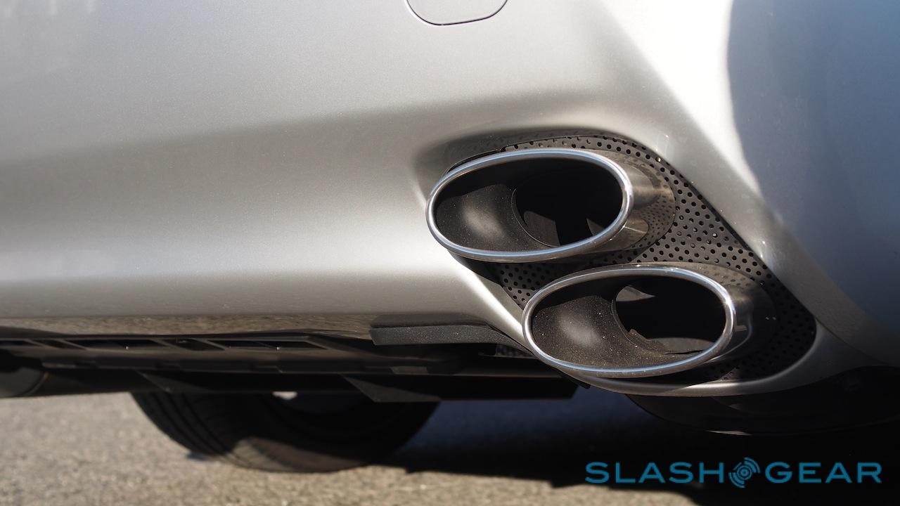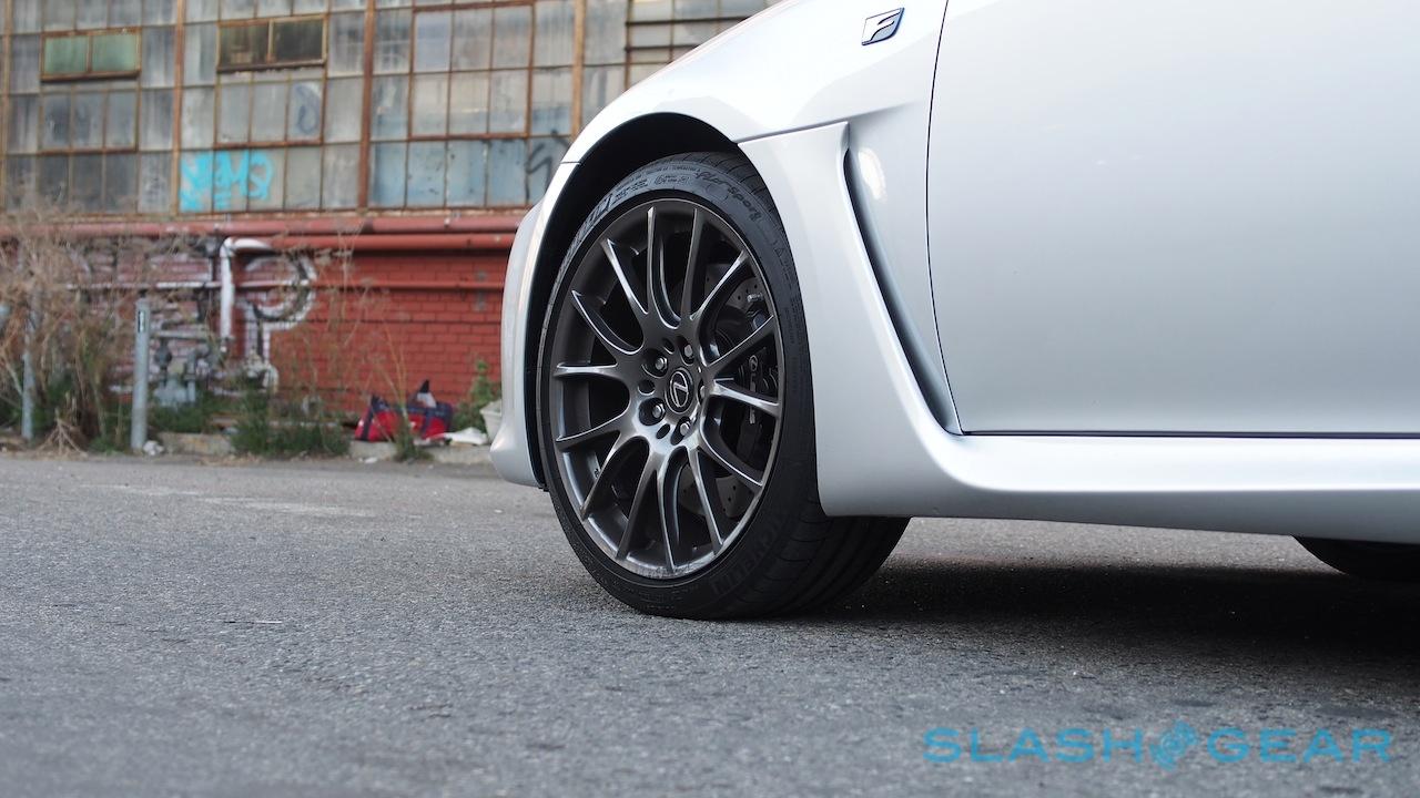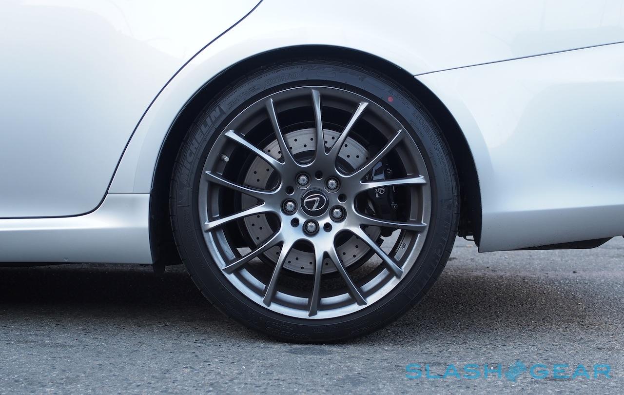 That's not to say the IS F isn't eye-catching in other ways. In fact, Lexus' four-door hot rod is so un-Lexus that it still surprises in the metal, probably second only to the no-longer-produced LFA for badge surprise. The swollen hood and dropped stance – which leaves the 19-inch smoked alloys filling the arches almost like a caricature – are joined by a carbon fiber spoiler for the 2014 refresh, along with LED fog lamps, but the bulging fenders and low spoilers still impress.