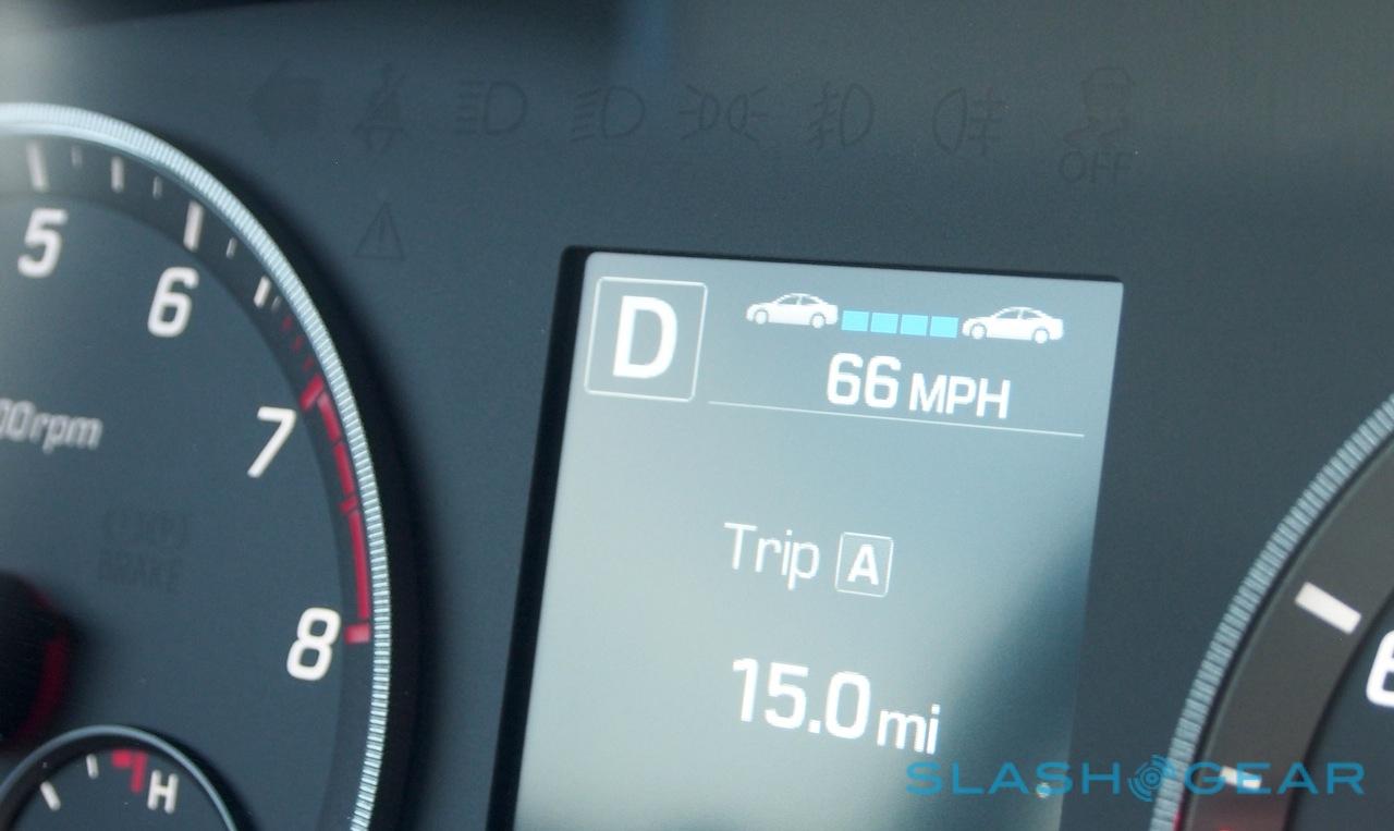 Best, though, is the smart cruise control. You have to accept an ugly black box in the center of the grill, but in return you get radar speed adjustment depending on the traffic in front. Set your preferred speed and the Sonata will automatically maintain it or adjust it as the car in front slows and speeds up again; the distance between can be set, too, down to a few car lengths.