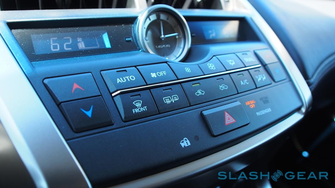 Lexus layers up different materials with various gloss and matte finishes, and the general look is good. Not everything is soft-touch, however, and while most of the points of common contact are pleasing under the fingers, the jutting chunks of silver plastic in the middle don't come close to resembling brushed aluminum. The analog clock feels out of place in the otherwise high-tech dash, while the twin HVAC displays – for the standard dual-zone climate control – flanking it can be washed out in sunlight.