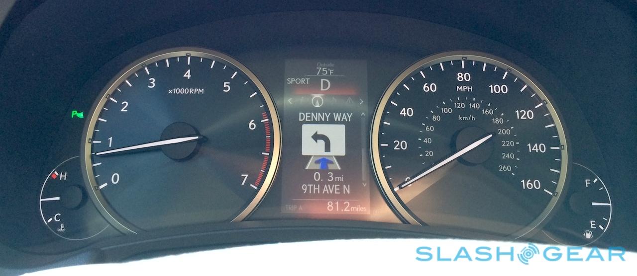 It's not all bad news. Lexus' 3D cities are neat, and the voice recognition system is a solid step-up from earlier cars, using Nuance technology that actively learns from repeated use. Pair up a smartphone over Bluetooth and the navigation will bring up POI results both from its own database and online, through Bing, showing only the most up-to-date information. Upcoming turns are telegraphed clearly using both a split-screen UI on the main display, and the 4.2-inch driver information screen sandwiched between the gages.