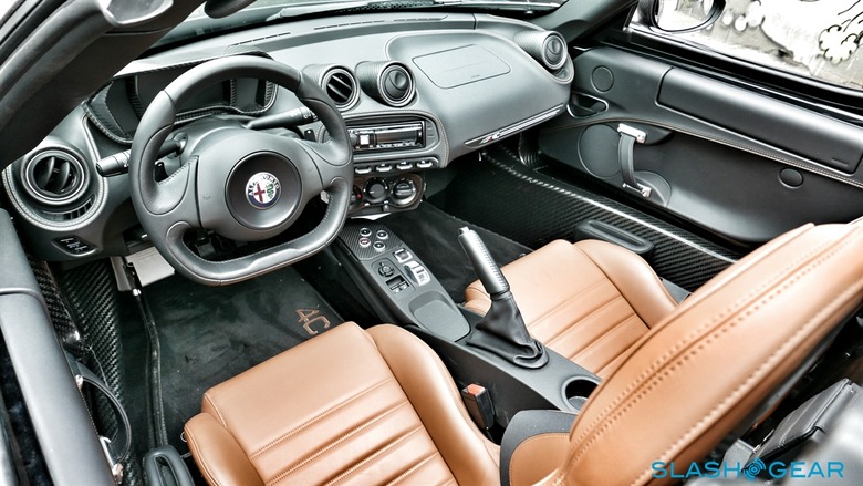 Once ensconced inside the car, you'll quickly discover that Alfa Romeo's ergonomics team was clearly only interested in keeping your gaze locked on the road ahead and your mind focused on the task at hand – that is to say, driving. Seat adjustability gets you closer or farther from the steering wheel, with a smidgen of rake thrown in to mollify taller individuals, but strangely, bolstering is minimal. An Alpine stereo deck is stuffed into the dash like an afterthought, a USB port hangs from underneath where you'd find a glove compartment on a 'normal' vehicle, and the automated manual transmission presents a four-button array splayed out on the center console that will confuse each and every valet unfortunate enough to pull Alfa duty. Forget a navigation system, because you're already there. You're driving.