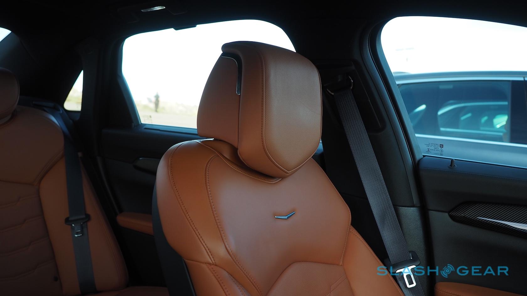 Unusually, rather than gawkily mounting them on the reverse of the front headrests, Cadillac has them motor out of a hunch on the seat back. Both height and tilt are adjustable – each screen will remember its last setting, too, and deploy to it automatically.