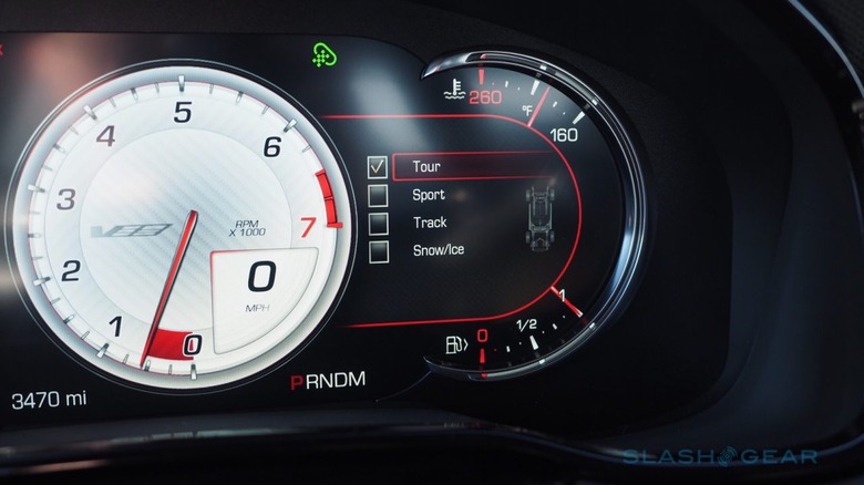 You could imagine the Cadillac shredding it's expensive, low-profile Michelin rubber with one jab of the throttle, but it's actually a fairly controlled experience. The CTS-V gets a slightly confusing double-level of driving modes and traction control. First, you can switch between the familiar four driving modes of touring, sport, snow, and track; then, there are five Performance Traction Management settings, starting out in "Wet" and then escalating up through "Dry", "Sport 1", "Sport 2", and finally the most extreme "Race".