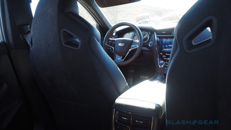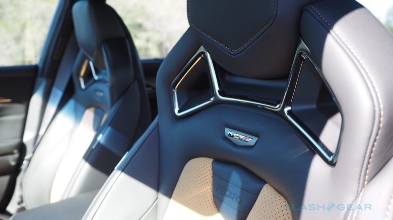 Don't dismiss Tour mode as the dull option, mind. Thanks to the Magnetic Ride Control, and Cadillac's acoustic treatment, the CTS-V is eminently capable of serving limo duty. The standard cabin is comfortable enough, with leather seats and microfiber inserts, but the $2,300 Recaro High Performance Seats of my review car threw in greater lateral support which was more than welcome (even if I might not have picked the "Saffron" accent color myself) together with 16-way power adjustment and optional massage.