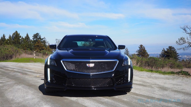 At the front, the regular grille's restraint has been blown through with a mesh version, atop a deep, meaty spoiler. A broad slab of vents cut into the sharply creased carbon-fiber hood, and everything is bracketed by Cadillac's distinctive LED lights which flow down crisply.